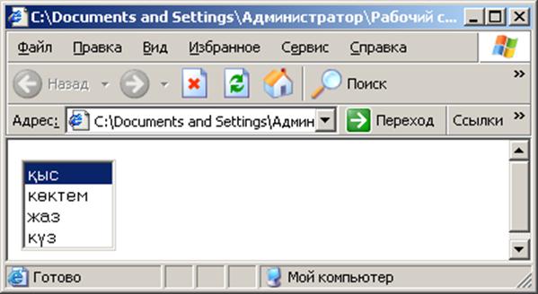 Мысал: Төменде ұқсас формалары бар екі HTML құжаттарының мәтіндері көрсетілген. Екінші құжатта тізімнен алдын ала бір элемент таңдалып алынған (SELECTED атрибуты қосылған). <HTML> <BODY> Жыл мерзімін таңдаңыз: <FORM> <SELECT NAME=YEAR> <OPTION SELECTED VALUE="winter"> қыс <OPTION VALUE="spring" > көктем <OPTION VALUE="summer"> жаз <OPTION VALUE="autumn"> күз </SELECT> </FORM> </BODY> </HTML>