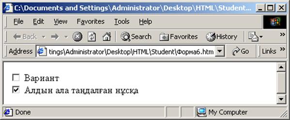 13 сурет TYPE атрибутының CHECKBOX мәнін қарастырайық. <HTML> <BODY> <FORM> <INPUT TYPE="CHECKBOX" NAME="CHECKBOX1” VALUE="checkbox_value1"> Вариант <BR> <INPUT TYPE="checkbox" NAME="checkbox2" VALUE="checkbox_value2" CHECKED> Алдын ала таңдалған нұсқа </FORM> </BODY> </HTML>