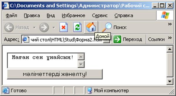 15 сурет Келесі формада TYPE атрибутының RESET мәні, яғни енгізілген мәліметтерді тазарту жолы қолданылған, нәтижесі 16 суретте көрсетілген. <HTML> <BODY> <FORM> Аты-жөніңізді енгізіңіз: <INPUT TYPE="text"> <BR> Телефоныңыз: <INPUT TYPE="text"> <BR> <INPUT TYPE="reset" VALUE="Форманы тазарту"> </FORM> </BODY> </HTML> Енді TYPE атрибутының SUBMIT мәнін қолданайық (16 сурет). <HTML> <BODY> <FORM> <TEXTAREA> Маған сен ұнайсың! </TEXTAREA> <BR> <INPUT TYPE="submit" VALUE="мәліметтерді жөнелту!"> </FORM> </BODY> </HTML>