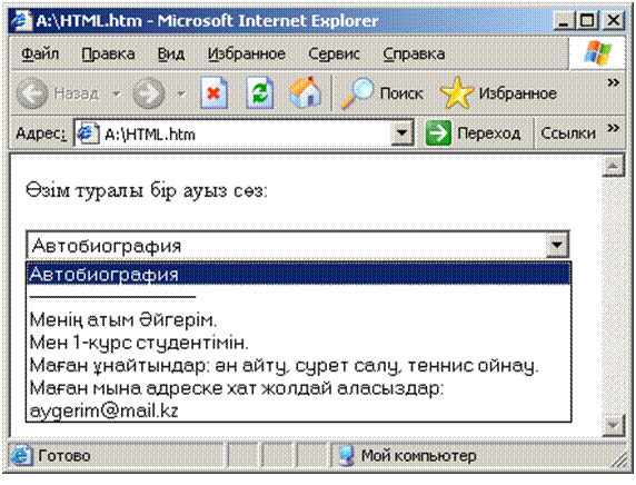 Осы суретке сәйкес программа мәтіні: <HTML> <BODY> Өзім туралы бір ауыз сөз: <FORM> <SELECT NAME="about"> <OPTION SELECTED VALUE="line0"> Автобиография <OPTION VALUE="line1">----------------------------- <OPTION VALUE="line2"> Менің атым Әйгерім. <OPTION VALUE="line3"> Мен 1-курс студентімін. <OPTION VALUE="line4"> Маған ұнайтындар: ән айту, сурет салу, теннис ойнау. <OPTION VALUE="line5"> Маған мына адреске хат жолдай аласыздар: <OPTION VALUE="line6"> aygerim@mail.kz </SELECT> </FORM> </BODY> </HTML>