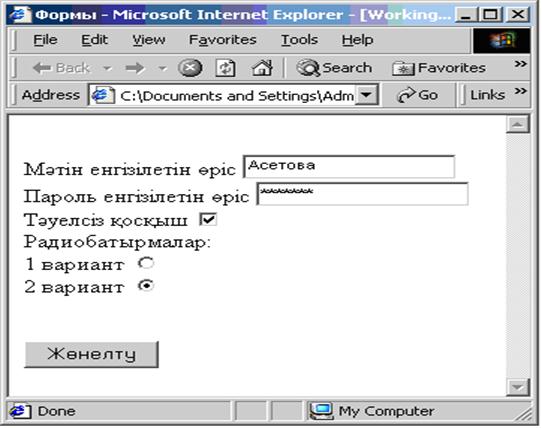 16 сурет 8.7. Форма элементтерін стандарттан тыс қолдану HTML тәгтерінің көбісі қолдану кезінде өздерінің негізгі қызметтерінен басқа мақсаттарда пайдаланылып жатады, мысалы, кестелер парақтарды белгілеу үшін қолданылады. Сондықтан форма элементтерін қолдану кезінде әр түрлі тәжірибе жасаудан тартынуға болмайды.