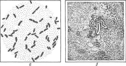 Рис. 2. Палочка перфрингенс (Cl. perfringens): а — в культуре; б — мазок-отпечаток из органа Токсинобразование. Палочка перфрингенс выделяет экзотоксин, содержащий различные токсические вещества. Кроме того, она может накапливать токсины в продуктах после их тепловой обработки и в процессе хранения при 18—20 °С и выше. Органолептические свойства продукта, обсемененного микроорганизмами, заметно не изменяются (исключение составляет молоко). Токсины, выделяемые палочкой перфрингенс, разрушаются под действием различных факторов внешней среды. Антигенная структура. Палочка перфрингенс по антигенной структуре и токсигенным свойствам разделена на 6 типов: А, В, С, D, Е, F. Пищевые отравления вызывает палочка перфрингенс типов А, С, D, F. Палочка перфрингенс типа F может явиться причиной тяжелейшей токсикоинфекции (некротического энтерита). Устойчивость. Палочка перфрингенс — весьма устойчивый микроорганизм. Вегетативные формы ее погибают при 80 °С через 30 мин, споры некоторых разновидностей этого микроорганизма могут выдерживать кипячение в течение 1—2 ч, а споры палочки перфрингенс типа F— в течение 3—6 ч. При воздействии 3—5%-ного раствора фенола вегетативные формы гибнут за 15—20 мин, а споры — через 8—10 ч. Патогенность. Палочка перфрингенс патогенна для голубей, морских свинок, мышей (погибают через 18—20 ч после заражения) и в меньшей степени для кроликов. Она является возбудителем газовой гангрены, некротического энтерита, дизентерии, энтеротоксемии у животных и пищевой токсикоинфекции у человека. Для животных патогенны типы В, С, D, E, а для человека — A, F и редко С, D. Диагностика. Диагностику пищевой токсикоинфекции, вызванной палочкой перфрингенса, осуществляют на основании клинических признаков и бактериологического исследования, включающего обнаружение возбудителя в фекалиях и пищевых продуктах (на наличие и установление антигенной идентичности выделенных штаммов).