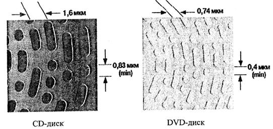 Внешне DVD-диск напоминает CD: оба являются оптическими дисками диаметром 12 см и толщиной 1,2 мм. Аналогичны они и по принципам записи цифровой информации. Оба состоят из прозрачной полимерной подложки, отражающего слоя и вспомогательного защитного слоя, придающего им необходимую жесткость. В отражающем слое тем или иным образом формируется своеобразная матрица – в виде закрученной в спираль дорожки с «дырками» (питами). Считывание информации производится лазерным лучом, сканирующим отражающую поверхность. При попадании в дырку луч отражается точно на регистрирующий детектор, его сигнал превышает заданный порог, что и соответствует логической единице. При отсутствии дырки луч рассеивается, сигнал с детектора оказывается ниже заданного порога – фиксируется логический ноль. CD- и DVD-диски во многом подобны, но их ключевые физические параметры значительно отличаются. Послойная структура одной