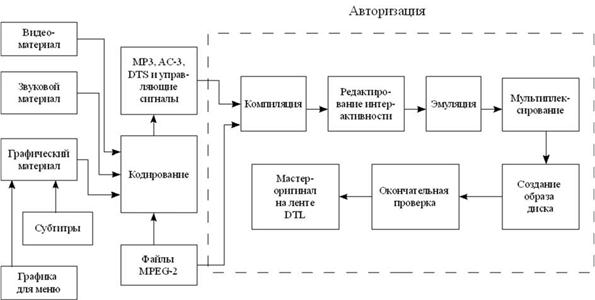 9.1. Технология производства DVD-фильмов [1] Процесс подготовки DVD-фильма можно разделить на два этапа: премастеринг и мастеринг. Премастерингом (PreMastering) называется процесс перевода звуковых и видеоматериалов в форму, пригодную для записи на DVD-диск. В процессе мастеринга выполняется фабричное производство DVD-диска.