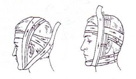 4.1. Бас жарақаты кезінде таза таңғыш қою тәртібі Басқа таңғышты-«тақияны» мынадай әдіспен қояды. 1м-ға жуық бинт кесіндісін төбеге қояды, оның ұшын (байламын) тік құлақ қалқанының алдынан төмен түсіреді. Басты айналдыра (6а-сурет) отыра байлайды, содан соң түйінге жеткен соң бинтті оның төңірегінен екі жағынан да орап қиғаштай желкеге жеткізеді, желке мен маңдай арқылы кезекпен орап, бастың бүкіл шашты бөлігін жабады (6б сурет). Бас ауқымды жараланған кезде беттің үстіндегі олардың орналасуына орай «ауыздық» тәріздес таңғыш қойған жақсы. Маңдай арқылы 2-3 рет айналдыра мығым орағаннан кейін (6а сурет) бинтті желке арқылы (7-сурет) мойын мен иекке апарады, иекпен төбе арқылы бірнеше рет тіктей орайды, содан соң иектен бинт желкеге апарылады. Мойынды, көмей мен иекті жабу үшін таңғыш (7б суретте) көрсетілгендей қойылады.