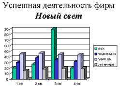 a) Используя кнопку "Свернуть все" на панели инструментов структуры, размещенную вертикально слева от рабочего окна, установить сокращенный список слайдов презентации. b) Перевести курсор в конец строки "МояСтруктура фирмыа" и нажать на клавишу Ввод". и записать "Успешная деятельность фирмы". Выбрать опцию Макет "Разметка слайда" в группе Слайды меню "Формат и выбрать нужное окно. Занести в заголовок "Успешная деятельность фирмы". тип авторазметки "Диаграмма". c) Подготовить слайд "Успешная деятельность фирмы" в текущем году в соответствии с рисунком (дать сведения о продукции по кварталам). d) Перевести курсор в конец списка иерархии., нНажать на клавишу "Ввод". вВыбрать тип слайда "Только заголовок", увеличить поле местозаместителя и записать "Спасибо за внимание" ‑ в верхней части местозаместителя, и "Прошу задавать вопросы" ‑ в нижней. В этом месте целесообразно использовать текстовые эффекты (WordArt). Сохранить презентацию. 2.2.Формирование итогового слайда: a) Перейти в режим структуры. Свернуть содержимое слайдов, щЩелкнуть на значке слайда 21 и, нажимая на клавишу Shift, щелкнуть по последнему слайду. редпоследней строке списка.Будут выделены все текстовые реплики. Сохранить их. b) Щелкнуть по кнопке "СоздатьИтоговый слайд" в группе Слайды и выбрать окно типа Заголовок и объект. панели "Структура". Итоговый слайд будет установлен в начало выделенного списка. Установить тип слайда "Список". Записать заголовок "Содержание презентации". c) Щелкнуть мышью в окне объекта и вставить в него скопированные тексты. Удалить лишнее, оставив только заголовки слайдов, оформить их в виде списка и отформатировать список. d) Сохранить презентацию. 3.1.Перемещение, вставка и удаление слайдов: a) Включить режим сортировщика слайдов с помощью соответствующей кнопкие на панели режимов. Все слайды будут высвечены на поле экрана. Над рабочим окном появится панель инструментов "Сортировщик слайдов". b) Щелкнув и захватив поле слайда 8 перетащить его за поле слайда 9 (Положение слайда будет показано с помощью тонкой вертикальной линии. Отменить операцию. c) Выделить третий слайд и щелкнуть правой кнопкой мыши, выбрать опцию по кнопке "Создать Вставить новый слайд". На поле авторазметки определить его тип. Новый слайд будет вставлен на место четвертого и он будет выделен. Через кнопку Макет На поле авторазметки установить его определить его тип. Проверить в основном режиме правильность выполнения манипуляций, d) Выделить только что установленный новый слайд и нажать на клавишу Del. Слайд будет удален. Сохранить презентацию. 3.3.Применить шаблон дизайна: a) Перейти на первый слайд, открыть вкладку Дизайн.включить режим "Вид слайдов", правой кнопкой вызвать контекстное меню. b) В группе темы Ввыбрать подходящий дизайн оформления слайдов и установить его. строку "Применить шаблон дизайна" (можно использовать опцию "Применить шаблон дизайна в меню "Формат"). Установить подходящий шаблон оформления слайдов (например, "современный"); c) Подобрать цвета, шрифты и стили фона для слайдов презентации. Выделить слайды, относящиеся к вашему бизнесу "Структура фирмы" и "Успешная деятельность", a) В меню "Формат" выбрать опцию "Цветовая схема слайда". Щелкая по каждому окну "Цветовой схемы" и по кнопке применить ознакомиться с воздействием каждой новой схемы на оформление выделенных слайдо