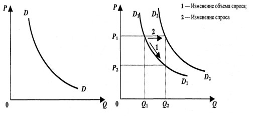 Изменения спроса и величины спроса При анализе рыночной конъюнктуры необходимо проводить четкое различие между спросом и величиной спроса, а также между изменениями величины спроса и изменениями в самом спросе на данный товар. Изменение величины спроса наблюдается при изменении цены рассматриваемого товара и неизменности всех прочит параметров (вкусов, доходов, цен на другие товары). На графике подобное изменение отражается движением вдоль кривой спроса из точки (стрелка №1). Изменение спроса происходит при неизменности рыночных цен на рассматриваемый товар, т.е. под воздействием каких-либо неценовых факторов, и на графике отражается смещением кривой спроса вправо или влево (стрелка №2).