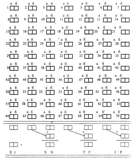 В четвертой строке таблицы помещен Ваш итоговый микротест. Его код – МАК. Псевдоним типа – Максим Горький. Доминирующие признаки типа – рациональность, сенсорика, логика, интроверсия, негативность. Наиболее же точно определить Ваш социотип позволит следующий тест. Опросник (тест) состоит из 70 вопросов (утверждений), каждое из которых имеет два продолжения (ответа). Подчеркиваем, что все ответы равноценны, правильных или неправильных ответов здесь быть не может. Ваша задача: а) прочесть каждое из утверждений вместе с двумя его возможными продолжениями; б) выбрать то продолжение, которое свойственно Вам в большинстве жизненных ситуаций; в) вписать знак плюс (+) в соответствующем квадрате регистрационного листа, левый квадратик соответствует варианту а), а правый варианту б). Просьба работать в темпе, подолгу не задумываясь над ответами. Работайте последовательно, не пропуская вопросов. Подсчет результатов производится простым суммированием количества крестиков (ответов по варианту "а" или "б") во всех вертикальных столбцах Регистрационного листа. Внизу каждого столбца расположены пустые ячейки, в каждую из которых следует записать соответственно количество ответов по варианту «а» или «б». Для первого столбца (шкала Е-I) обработка результатов на этом заканчивается, а данные столбцов 2-3(S-N), 4-5(Т-F), 6-7(J-Р) попарно складываются, и сумма записывается в нижние пустые ячейки, рядом с которыми стоят буквенные обозначения шкал. Таким образом, Вы получите четыре пары чисел в нижних пустых ячейках. Затем обведите ту букву, которой соответствует большее число из пары. Если числа равные, обводите правую букву. В результате Вы получили четыре объединенные буквы, обозначающие психологический портрет. Затем определим яркость выраженности Вашего типа или просто «яркость». Яркость обозначается добавлением к одной из четырех букв символа. Например, Е(в), I(в), S(в), N(в), Т(в) и т.д. Яркость вычисляется следующим образом: для первой шкалы (Е-I) от большего числа в паре чисел, записанных в нижних ячейках, отнимаем число 5. Результат умножаем на 2. (Е-I)(в)=(мах-5)*2, где мах - большее число из пары записанной внизу регистрационного листа. Полученная яркость записывается на бланке ниже Вашей обведенной буквы. Для остальных шкал порядок вычисления яркости еще более прост. От большего числа в паре нижних чисел отнимаем –10. Арифметическая сумма яркостей по всем четырем шкалам представляет собой суммарную яркость выраженности Вашего типа. Подобная характеристика позволяет разделить людей на «ярких» (от 20 до 40) и «неярких» (от 0 до 20). Для первых характерна высокая степень соответствия личностных характеристик полученному типологическому портрету и устойчивость типологической группы во времени – лишь 8% из числа «ярких» изменяют свой тип через 10 месяцев. Степень соответствия портрета особенностям личности «неярких» представителей может быть несколько меньше, чем «ярких». При интерпретации руководствуйтесь следующим правилом: если по какому-либо из качеств Вы получили яркость в диапазоне 1-3, считайте, что вероятность наличия у Вас ряда качеств из противоположной группы также весьма велика. Степень соответствия Ваших свойств свойствам Вашего портрета равна примерно 60%. При яркости 4-8 Вы - средний представитель данной группы. В таком случае Ваши черты на 85% совпадут 