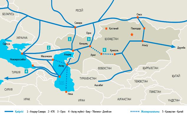 5сурет. Компания қолданыстағыкөліктікбағыттары 2005 жылдың желтоқсанында Қазақстан мен Қытайдың арасында ұзындығы 1 000 км. Атасу-Алашаңқай құбыр желісі іске қосылды. Құбыр желісінің өткізу қабілеті жылына 10 миллион тоннаны (тәулігіне 202 мың баррелді) құрайды және таяудағы болашақта екі есеге арттырылуы мүмкін.2006 жылдың шілдесінде Каспий және Жерорта теңізін тікелей жалғастыратын, өткізу қабілеті жылына 50 млн. тонна (тәулігіне 1 млн. баррель) тұңғыш құбыр желісі пайдалануға берілді. Баку-Тбилиси-Джейхан құбыр желісі Әзірбайжандағы Бакуден Түріктің Джейхан айлағына дейін барады. Бұл Қазақстанда өндірілетін мұнай үшін транзиттік мүмкіндіктерді кеңейте түсетін тағы бір бағыт.Келтірілген мысалдар көрші елдерге тәуелділікке қарамастан Қазақстан мұнайдың экспорттық рыноктарына кіруді диверсификациялауға және ұдайы үдете түсуге ұмтылып отырғанын көрсетеді. Бұл ретте КМГ БӨ-нің өзінің бас компаниясымен қарым-қатынасы Компанияға ҚМГ ҰК-ге тиесілі көлік инфрақұрылымдарына кепілдікті қол жетімділігі болуға мүмкіндік береді.2012 жылы ҚМГ БӨ, ОМГ және ЭМГ активтерінде өндірілген бүкіл мұнай өнімнің 78 %-ын экспортқа шығарды. Осы кезең ішінде, Компанияның толык (ОМГ және ЭМГ активтерінен) мұнай сату көлемінің 33% КҚК құбыр аркылы және 46% ӨАС құбыр аркылы сатылды.(6 сурет) Болашақта Компания қолданыстағы көліктік бағыттарды пайдалануды оңтайландыра түсуді, ішкі рынокқа берудің экономикалық тиімділігін арттыруды жоспарлап отыр.Қолданыстағы экспорттық күштер Қазақстанның мұнай өндіру саласының қазіргі қажеттіліктерін қамтуға жеткілікті. «ҚазМұнайГаз» елімізде өндірілетін мұнайдың негізгі көлемін тасымалдауды «ҚазТрансОйл» АҚ (КТО) мен Каспий құбыр консорциумы (КҚК) магистралды мұнай құбырлары арқылы жүргізеді. 2013 жылдың қорытындысы бойынша, Қазақстан аумағында жобаны жүзеге асыру аясында 116-дан бастап 204 км-ге дейін мұнай құбыры учаскесін ауыстырудың барлық құрылыc-монтаж жұмыстары, Атырау мен Теңіз мұнай айдау бекеттерін қайта қалыпқа келтіру мен жаңғырту жұмыстары және т.б. аяқталды. Ұлттық компанияның әртараптандырылған саясатының арқасында қазіргі таңда Қазақстанда өзге де экспорттық бағыттар, әсіресе Шығыс бағыты дамуда [12].