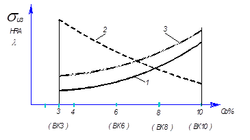 1) Прочность на изгиб sизг; 2) Твердость – HRA; 3) Теплопроводность - λ Рисунок 2.2 – Влияние кобальта на свойства твердого сплава группы (ВК)