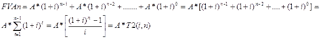 Будущая стоимость серийных платежей (аннуитетов). Широкое распространение в практике финансовых расчетов имеют серийные выплаты (или поступления) равновеликих сумм в течение фиксированных интервалов времени, иначе называемые аннуитетами. Примерами аннуитета является последовательность получения процентов по облигациям, платежи по потребительскому кредиту, выплаты страховых премий в рассрочку и пр. Аннуитеты различаются между собой следующими основными характеристиками: - член аннуитета (А) - размер отдельного платежа; - период аннуитета - временной интервал между двумя последовательными платежами; - срок аннуитета (п) - время от начала первого периода ренты до конца последнего (или неогранченные во времени аннуитеты, т. н. «вечные»); - процентная ставка ii), размер которой не всегда прямо оговаривается в условиях финансовой операции; однако этот параметр крайне необходим для ее анализа - дополнительные условия и параметры, необходимые для характеристики некоторых видов аннуитетов (например, число платежей в году, способ и частота начислений процентов, параметры, характеризующие закономерность изменения размеров члена ренты во времени). Наибольшее распространение на практике имею аннуитеты постнумерандо (обычные), когда суммы денежных средств вносятся в конце каждого периода. Задачей финансовой математики является определение будущей стоимости серии равных периодических выплат (FVAn) в течение определенного временного периода (n) при заданной процентной ставке (i) по следующей формуле: