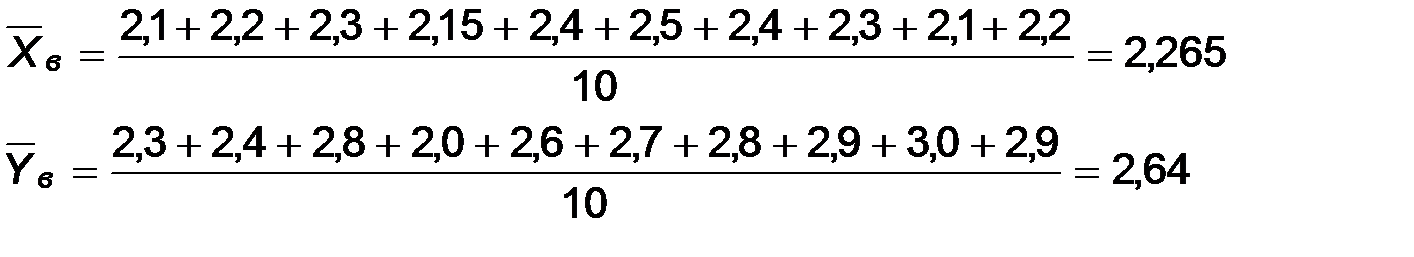 Пример. По результатам выборок двух наблюдаемых признаков, распределенных по нормальному закону с дисперсиями X: 2,1; 2,2; 2,3; 2,15; 2,4; 2,5; 2,4; 2,3; 2,1; 2,2 Y: 2,3; 2,4; 2,8; 2,0; 2,0; 2,6; 2,7; 2,8; 2,9; 3,0; 2,9 Выполним необходимые расчеты:
