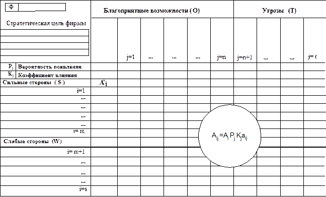 Приведенная на этом рисунке форма заполняется экспертами по следующим правилам: 1. В рамке Ф написать свою фамилию; 2. В рамке “Стратегическая цель фирмы” записать суждение эксперта; 3. В разделе “ О ” заполнить столбцы перечнем благоприятных возможностей, которые могут представиться в будущем; 4. В разделе “ Т ” выполнить тоже для угроз; 5. В строке Р j проставить вероятность (в пределах от 0 до 1) появления конкретных благоприятных возможностей и угроз; 6. В строке K j проставить значение коэффициента влияния на деятельность фирмы конкретных благоприятных возможностей или угроз, руководствуясь следующими правилами: - никак не влияет на деятельность фирмы – оценка 0; - создает коренные новые возможности или в случае реализации угрозы деятельность организации может быть прекращена – оценка 1; - промежуточные случаи: - слабое влияние 0,1 – 0,3; - среднее влияние 0,4 – 0,6; - сильное влияние 0,7 – 0,9; 7. В столбце “ S ” заполнить строки сильных сторон в деятельности фирмы. 8. В столбце Аi проставить оценку интенсивности этих факторов в пределах (1–5), пользуясь следующими правилами: - оценка 5 – отличительное преимущество; - оценка 4 – 3 – интенсивность четко выше, чем среднеотраслевая; - оценка 2 – 1 – интенсивность вероятно выше, чем среднеотраслевая, но это недостоверно. 9. То же выполнить в столбце Ai для слабых сторон в деятельности фирмы, записанных в столбце “ W ”, пользуясь следующими правилами: - оценка –5 – в деятельности фирмы эта сторона практически не представлена; - оценка –4, –3 – позиция по этому фактору слабее среднеотраслевой; - оценка –2, –1 – интенсивность фактора возможно слабее среднеотраслевого значения, но это недостоверно. 10. В квадрантах SO, ST, WO, WT выставить в соответствующих клетках (aij) оценки влияния соответствующих факторов S и W на использование благоприятных возможностей или на защиту (или усугубление) от опасности, пользуясь следующими правилами: - оценка +5 – фактор дает полную возможность использовать благоприятные возможности или предотвратить отрицательные последствия угроз; - оценка +4, +3 – содействие использованию благоприятных возможностей или защите от угроз; - оценка +2, +1 – положительное влияние на использование благоприятных возможностей или защиту от угроз; - оценка 0 – нет практического влияния фактора на конкретные факторы О и Т; - оценка –1, –2 – отрицательное влияние на использование благоприятных возможностей или содействие усилению угрозы; - оценка –3, –4 – сильное отрицательное влияние на использование благоприятных возможностей или четкое усиление угрозы; - оценка –5 – невозможность использовать благоприятные возможности и предотвратить действие угрозы. Оценки в этих квадрантах должны выставляться без учета реальной интенсивности фактора для фирмы (это учтено в столбце Аj), то есть производятся экспертные оценки влияния силы или слабости номинального идентифицированного фактора на отмеченные благоприятные возможности или угрозы.
