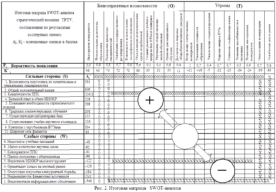 Оценки экспертов в клетках aij затем транспонируются в оценки Пример такой итоговой матрицы для Таганрогского государственного радиотехнического университета (ТРТУ) приведен на рис. 2. Что особенно важно: сильные и слабые стороны организации автоматически определяются по всей совокупности благоприятных возможностей и угроз. Поэтому естественным решением является построение стратегии организации на особенно сильных сторонах (отличительных преимуществах). Эта зона на рис. 18 выделена значками “0”. Особенно целесообразна готовность к использованию наиболее эффективных благоприятных обстоятельств (зона “00”). Соответственно особенно опасна и подлежит устранению или защите зона “ХХ”.