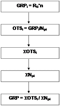 Значения GRP рассчитываются умножением рейтинга на число выходов рекламного сообщения. Значение частного количества контактов OTS для каждого региона определяем, перемножая соответствующие частные GRP и численности потенциальной аудитории. Суммарное количество контактов составляет: 13,079,970 + 5,137,440 + 4,610,580 = 22,827,990 а суммарная потенциальная аудитория - 5,253,000 + 2,224,000 + 1,542,000 = 9,019,000. Общий GRPРК рассчитываем так: Общий GRPРК = 22,827,990 / 9,019,000 = 2.53 (в долях, десятич.дробь) ---------------------------------------------------------------------------------------------- Для случая когда рейтинги определены на разной базе GRP = SOTSi / S Npi Порядок расчета GRP:
