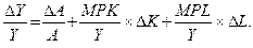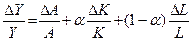 Примеры решения задач 1. Экономика страны описывается производственной функцией вида Y = A·K0,4·L0,6. Известно, что темп прироста капитала равен 3% в год, а численности занятых – 2%. Общая производительность факторов растет с темпом 1,5% в год. Как меняется объем производства? В неоклассической модели роста была использована производственная функция вида Y = AF(K,L). Объем производства Y зависит от вклада факторов – труда L и капитала K, а также от технологии. Производственная функция имеет постоянную отдачу от масштаба, т. е. увеличение всех факторов в определенной степени приводит к росту выпуска в той же степени. Изменение выпуска можно представить как ДY = AF(K,L)·ДА + МРК·ДК + МРL·ДL, где МРК и МРL – предельные производительности соответствующих факторов. Разделим это выражение на Y = AF(K,L) и получим: В представленной функции Y = A·K0,4·L0,6 показатели степени представляют и долю факторов в доходе, то есть Тогда 2. Производственная функция задана уравнением