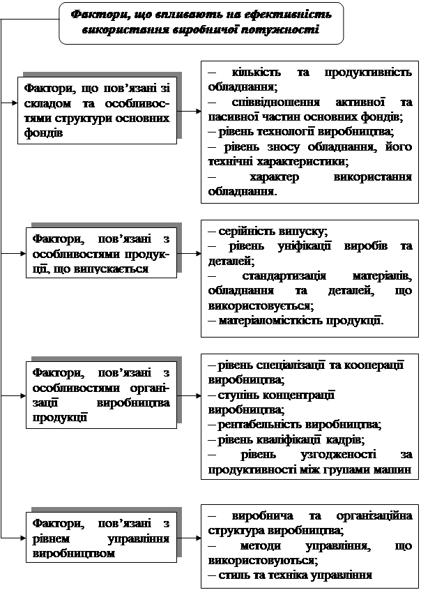 1. Розкрийте роль виробничих фондів у здійсненні процесу виробництва та реалізації продукції. 2. Дайте визначення сутності основних фондів та їх призначення в підприємстві. 3. Назвіть ознаки за якими класифікують основні фонди підприємства. 4. Дайте класифікацію основних фондів за ознакою функціонального призначення, участі у виробничих процесах. 5. Які оцінки використовують для визначення наявності та руху основних фондів? 6. Що характеризують натуральні показники основних фондів і з якою метою вони використовуються? 7. Призначення вартісних показників оцінки основних фондів, їх види і сутність. 8. Які види зносу основних фондів ви знаєте? Дайте визначення кожному. 9. Розкрийте сутність амортизації основних фондів підприємства. 10. Які методи амортизації основних фондів підприємства існують? 11. Назвіть види відтворення основних фондів. Наведіть приклади простого та розширеного відтворення. 12. Дайте характеристику показникам, що характеризують ступінь зносу та інтенсивність відновлення основних фондів підприємства. 13. Завдяки яким показникам визначають ефективність використання основних фондів? Наведіть алгоритми їх розрахунку та дайте економічну характеристику кожному. 14. Дайте характеристику виробничої потужності підприємства. 15. Назвіть види виробничої потужності підприємства. 16. Наведіть основні принципи розрахунку виробничої потужності підприємства. 17. Які фактори впливають на величину виробничої потужності підприємства? 18. Шляхи підвищення ефективності використання основних фондів та виробничої потужності підприємства. 19. Охарактеризуйте екстенсивний та інтенсивний напрямки підвищення ефективності використання основних фондів підприємства. 20. Як оцінюється ефективність використання виробничої потужності підприємства?