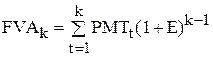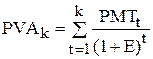 где FVAk – будущая стоимость аннуитета; PMTt – платеж, осуществляемый в конце периода t; Е – уровень дохода; k – число периодов, в течение которых получается доход. Текущая стоимость аннуитета определяется по формуле:
