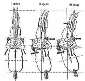 III фаза. Как только лошадь немного приняла, всадник укорачивает и внешний повод. Поскольку шея лошади уже изогнута, он действует при наборе в направлении хорды дуги окружности, усиливая принимание, и одновременно давит на изогнутую шею. Перенос кисти через холку недопустим. Пояснично-крестцовый отдел, корпус, оба шенкеля и внутренний повод воздействуют, как и прежде. Важнейшим воздействием в этом случае является перенос корпуса; так же меняет направление движения и велосипедист не столько поворотом руля, сколько наклоном корпуса. Если этого не произойдет, то все движения лошади и всадника будут негармоничными. Ибо всадник должен постоянно согласовывать положение своего центра тяжести с центром тяжести лошади. Если он требует, чтобы лошадь изогнулась по всей своей длине, то центр тяжести ему следует перенести назад. Если же лошадь изогнется вокруг внутреннего шенкеля, то всадник и сидеть должен соответствующим образом, т.е. кости таза и бедра должны давить вперед, внутренний шенкель воздействовать вплотную у подпруги, а внешний шенкель на расстоянии ширины ладони сместиться за подпругу. Трудно сказать, чему следует придавать большее значение во II фазе: удлинению внешнего повода или укорочению внутреннего. Это зависит от того, как выезжена и восприимчива лошадь. Во всяком случае, одним набором повода внутренней кисти всадник не сможет достичь чистого принимания лошадью внутрь. Раньше или позже любая лошадь воспротивится такому воздействию. В работе с молодыми и горячими лошадьми продвижение вперед внешней кисти руки, конечно, важней, чем набор внутреннего повода. Только в III фазе, после того как достигнуто некоторое принимание внутрь, всадник набирает оба повода, причем внешний сильней, чем внутренний. В то время как внутренний повод мягко заботится о сохранении контакта, внешний повод дает лошади постав и усиливает само принимание. Искривление шеи лошади или ее сопротивление и непослушание чаще возникают от слишком сильного воздействия внутреннего повода, чем от сильного воздействия внешнего. Если лошадь искривляет шею, отказывается принимать, тянет вперед или пятится назад, мотает головой, то всаднику следует поехать вперед и проверить, повинуется ли лошадь его посылам. Самоконтроль во время езды на принявшей лошади труднее, чем при выполнении всех других заданий. Даже если в манеже поставлены зеркала, у многих всадников таки бывают ошибки в посадке. Только после того, как всадник практически научится использовать принимание при езде на вольту, серпантином и на галопе, а также при поворотах на месте и прежде всего при повороте на задних ногах, он сможет проверить свое умение заставить лошадь принимать. Часто дают плохой совет, рекомендуя для езды с приниманием отодвинуть назад внешнее плечо. Это советуют потому, что многие всадники во время езды так скованы, что, отодвинув назад внешнее плечо, они одновременно отодвинут назад и внешнее бедро. Но внешнее бедро не следует отодвигать назад, нужно внутреннее бедро подвинуть вперед, а это не одно и то же. Кроме того, каждый человек может передвигать плечи и бедра независимо друг от друга, а во время верховой езды он должен быть так расслаблен, чтобы мог это сделать. Но если всадник скован, то нет смысла усугублять это состояние. Внешнее же плечо при езде с приниманием нужн