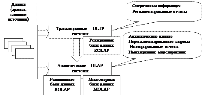 Хранилища данных и системы оперативной аналитической обработки данныхАрхитектура Интернет/Интранет Клиент-серверные информационные системы Файл-серверные информационные системы Используется общее хранилище файлов на файл-сервере, каждый файл хранит данные с фиксированной структурой (различной для разных файлов). Компоненты информационной системы, выполняемые на разных ПК, взаимодействуют только за счет наличия общего хранилища файлов на файл-сервере. В классическом случае в каждом ПК дублируются не только прикладные программы, но и средства управления базами данных. Файл-сервер представляет собой разделяемое всеми ПК расширение дисковой памяти. Возможность выборки согласованной (по заданному критерию) информации из нескольких файлов не поддерживается. Информационная система основана на использовании серверов баз данных. С ервер баз данных - программный комплекс, привязанный к соответствующей базе (базам) данных, существующий независимо от пользовательских (клиентских) процессов. Такое программное обеспечение выполняется (хотя и не обязательно) на выделенной аппаратуре. Конкретное воплощение программного комплекса и выделенной аппаратуры различается в разных серверах баз данных. Серверы баз данных существенно сложнее по организации, чем СУБД-ФС, но обеспечивают более тонкое и эффективное управление базами данных. Клиентская часть приложения взаимодействует с клиентской частью программного обеспечения управления базами данных, которая, фактически, является индивидуальным представителем СУБД для приложения. Информационная Intranet-система - это корпоративная система, в которой используются методы и средства Internet. Интранет — это «частный» Интернет, ограниченный виртуальным пространством отдельно взятой организации. В основе реализации корпоративных информационных систем на базе данной архитектуры лежит принцип "открытой архитектуры" что во многом определяет независимость реализации корпоративной системы от конкретного производителя. Такая система может быть локальной, изолированной от Internet, или опираться на виртуальную корпоративную подсеть Internet (в этом случае особенно важны средства защиты информации от несанкционированного доступа). Рассмотренные способы и возможные архитектуры информационных систем, предназначены для оперативной обработки данных, т.е. для получения текущей информации, позволяющей решать повседневные проблемы корпорации. Объективно сложилось так, что внедрение информационных технологий в подавляющем большинстве организаций осуществлялось без стратегического плана развития (по мере развития технического и программного обеспечения, по мере осознания необходимости автоматизации того или иного участка деятельности), отдельными, изолированными друг от друга фрагментами. Следствием этого на сегодняшний день в большинстве организаций функционируют разнородные и слабо связанные между собой информационные системы, которые функционируют на различных технических и операционно-системных платформах, и используют различные СУБД. Эти системы обслуживают в первую очередь текущую, повседневную деятельность отдельных подразделений (бухгалтерию, кадры, склад, маркетинг и т.д.). Такие информационные системы получили название транзакционных или OLTP (On-Line Transactions Processing). Существую