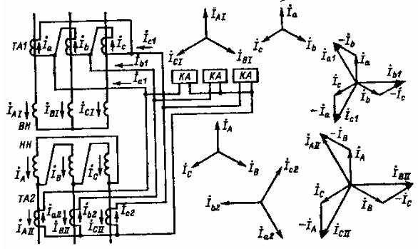 При неодинаковых схемах соединения обмоток, например звезда-треугольник, токи со стороны обмотки, соединенной в звезду, и токи со стороны обмотки, соединенной в треугольник, оказываются сдвинутыми относительно друг друга на некоторый угол, который зависит от схемы соединения обмоток. Для обычно применяемой группы Υ/∆-11 вторичный ток опережает первичный на угол 30°. Угловой сдвиг токов создаёт небаланс в реле дифференциальной защиты, который нельзя компенсировать подбором витков. Компенсация углового сдвига производится путем специального соединением вторичных обмоток трансформаторов тока. Для этого на стороне звезды трансформаторы тока соединяются в треугольник, а на стороне треугольника – в звезду (см. рис. 5.4). При таком соединении вторичных обмоток ТТ, как показано на рис. 5.4, в трансформаторах тока ТА1, вторичные обмотки которых соединены в треугольник, создается сдвиг токов на такой же угол, как и в соединенной в треугольник обмотке НН трансформатора, что и обеспечивает совпадение фаз вторичных токов. Современные цифровые защиты (фирм ABB, SIEMENS, ALSTOM, GE) получают разность фазных токов математическим путём. У таких защит трансформаторы тока со всех сторон соединяются в звезду, а группа соединений трансформатора и полярность ТТ вводится в реле в виде уставки. Соединение в звезду выгоднее в части величины нагрузки на трансформаторы тока (при соединении трансформаторов тока в треугольник нагрузка на трансформаторы тока вырастает в 3 раза).