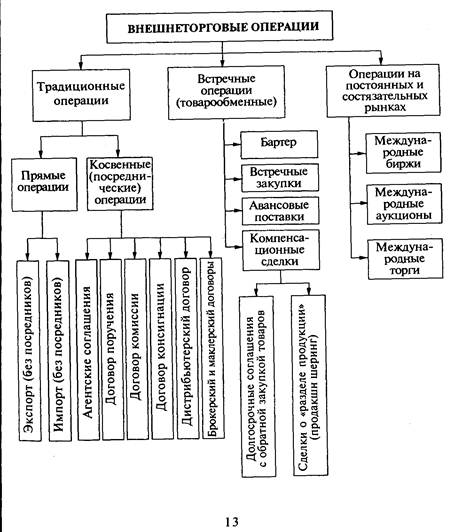Наиболее традиционной и распространенной формой внешнеэкономической деятельности предприятий являются внешнеторговые операции. Предметом купли-продажи во внешнеторговых (ВТ) операциях являются товары, работы, услуги, информация и результаты интеллектуальной деятельности, в том числе исключительные права на эти результаты. Товар по российскому законодательству это любое движимое имущество (включая все виды энергии) и отнесенные к недвижимому имуществу воздушные, морские суда, суда внутреннего плавания и космические объекты, являющиеся предметом внешнеторговой деятельности. Услуги — предпринимательская деятельность, направленная на удовлетворение потребностей других лиц, за исключением деятельности на основе трудовых соглашений. Работы — вид производственной деятельности (строительно-монтажные, ремонтные, сервисно-технические, пуско-наладочные, эксплуатационные, геологоразведочные, бурильные и др.), осуществляемой за рубежом и сопровождаемой, как правило, экспортом рабочей силы (командированием специалистов) на контрактной основе. Информация — сведения, данные (базы данных), охватывающие предпринимательскую деятельность (биржевую, финансовую, коммерческую, экономическую, статистическую), производственную, научно-технические и специальные знания, а также массовые потребительские знания (материалы средств массовой информации, электронные справочники, энциклопедии и т. п.), и другие знания, являющиеся предметом купли-продажи на мировом рынке. Результаты интеллектуальной деятельности — литературные, художественные и научные произведения, программы для ЭВМ и базы данных, изобретения, промышленные образцы, модели, фирменные наименования, товарные знаки и другие результаты интеллектуальной собственности, охрана которых предусмотрена законом. Предметом внешнеторговых сделок являются также исключительные права на эти результаты. Далее по тексту все указанные предметы внешнеторговых операций мы будем называть для краткости «товаром». Основными видами внешнеторговых операций являются: - импортная операция - приобретение товара у иностранного продавца с завозом в страну покупателя; - экспортная операция - продажа товара иностранному покупателю с вывозом из страны продавца; - реэкспортная операция - приобретение товара у иностранного продавца с завозом в страну импортера для последующей перепродажи этого товара без переработки иностранному покупателю; - реимпортная операция - ввоз из-за границы ранее вывезенных отечественных товаров, не подвергшихся там обработке. Основанием для реэкспорта могут быть несколько ситуаций. - Это - использование традиционно сложившихся организационных форм торговли на внешнем рынке, таких, как международные биржи и аукционы. Реэкспорт в этом случае является естественным продолжением торговой операции, требующей для продажи через биржу или аукцион ввоза товара в страну их местонахождения с последующим его вывозом покупателем третьей страны. - Кроме этого, ситуация вынужденного реэкспорта может возникнуть в процессе прерывания нормального хода внешнеторговой операции в случае отказа покупателя оплатить товар в момент прибытия его в порт назначения или состояния банкротства покупателя, наступившего на период отправки ему товара. - Реэкспорт выступает также составно