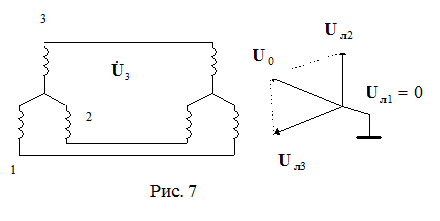 Фазовые U и I называют U и I прямой последовательности; U0 и I0 земляной волны называют U0 и I0 нулевой последовательности. В случае неисправности, например, при заземлении 1 фазы, ЛЭП с изолированной нейтралью становится несимметричной (рис. 6).