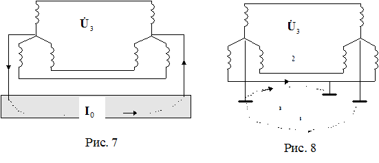 Напряжение земляной волны резко возрастает. Оно становится равным U0= 1,73 UЛ, где UЛ - линейное напряжение ЛЭП. Такое напряжение U0 в зависимости от условий сближения может вызвать в соседних цепях, подверженных влиянию, повышенные мешающие или даже опасные электрические влияния. Напряжения и токи ЛЭП, кроме основной гармоники f = 50 Гц, содержат высшие гармоники от 0,1 до 150 кГц и имеют наибольшие амплитуды в спектре тональных частот (0 - 4 кГц). Гармонический состав U и I ЛЭП зависит от нагрузки. Особенно больших значений достигают гармоники в линиях передачи, питающих установки с ртутными выпрямителями (электротяговые подстанции, преобразовательные подстанции для ЛЭП постоянного тока, мощные радиостанции и т. п.). Таким образом, в аварийном режиме эти ЛЭП могут оказывать одновременно опасные и мешающие влияния. Опасные влияния вызывает основная гармоника U f = 50 Гц, а мешающие - высшие гармонические. Для трёхфазной трехпроводной ЛЭП с заземлённой нейтралью справедливо всё, что и для ЛЭП с изолированной нейтралью. Разница заключается в том, что под действием U0 напряжения нулевой последовательности в заземлённой нейтрали линии появляется ток I0 нулевой последовательности, замыкающийся через землю. Этот ток (рис. 7,8) возбуждает неуравновешенное магнитное поле земляной волны.