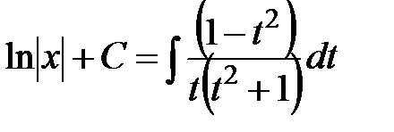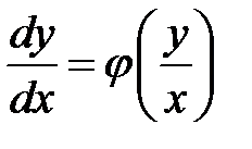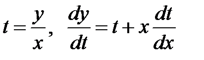 Если в уравнении функции М (x,y) и N (x,y) являются однородными функциями одной и той же степени, то уравнение (1) называется однородным. Приведенное свойство однородных функций нулевого порядка используется при решении однородных дифференциальных уравнений, то есть имеет место равенство ƒ (x,y) = При произвольно заданной непрерывной функции j переменные не разделяются. Но так как в правую часть переменные входят только в комбинации y=tx, (3) тогда Подставим выражения (3) и (4) в уравнение (2) Таким образом, мы получили уравнение с разделяющимися переменным В случае, когда Алгоритм решения однородного дифференциального уравнения: 1. Ввести новую функцию t = 2. В новых переменных t и x получить уравнение с разделяющимися переменными и найти его общее решение. 3. В полученном решении произвести обратную замену переменных t = Пример 2. Решить уравнение Решение. Разделим числитель и знаменатель правой части на x 2: