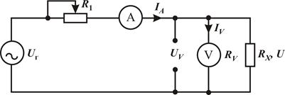 В схеме (см. рис. 8.8,а) вольтметр показывает значение напряжения на зажимах RХ (U = UХ), амперметр – сумму токов IА = IV + I, следовательно