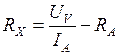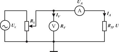 Для измерения больших сопротивлений (до сотен кОм и более) применяют схему (рис. 8.8,б), где амперметр регистрирует значение тока в цепи RХ (I = IА), а вольтметр – сумму падений напряжений (U + UA). По показаниям приборов можно вычислить результат измерения