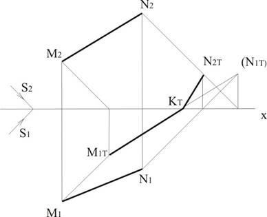 В ряде случаев тень от прямой может падать одновременно на две (или более) плоскостей. В этом случае она будет преломляться на линиях пересечения заданных плоскостей. Пусть необходимо построить проекции падающей тени от отрезка СД (рис. 12.10). Построив проекции тени от точек С и Д, видим, что тень от отрезка СД падает на две плоскости проекций П1 и П2 и представляет собой ломаную линию. Для построения этой линии необходимо построить тень от любой промежуточной точки К отрезка СД. Построив тень Д1тК1т от отрезка ДК продолжив ее до пересечения с осью Х в точке Ет, найдем точку преломления тени. Зная точку Ет, достроим тень от отрезка СД на плоскость проекций П2, т.е. участок ЕтС2т. Тень от прямой, одновременно падающую на две плоскости проекций, можно построить и другим способом (рис.12.11). Строим тени точек М и N. Тень М1т точки М лежит в горизонтальной плоскости проекций П1. Тень N2т от точки N будет падать на фронтальную плоскость П2. Для построения точки преломления тени на оси Х найдем мнимую тень точки N на плоскость проекций П1, точка (N1т). Полученную точку (N1т) соединим с точкой М1т и в пересечении этого отрезка с осью Х находим точку Кт как точку преломления тени. Зная точку Кт, построим ту часть тени, которая падает на плоскость П2, т.е. участок КтN2т.