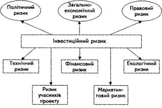 Рис. 1. Форми інвестиційного ризику Політичний, правовий та загальноекономічний ризики - це зовнішні умови реалізації інвестицій. Оскільки інвестиційна діяльність здійснюється в економічній сфері, то вона в найбільшому ступеню підпадає під вплив економічного ризику. Політичні та правові ризики характеризуються виникненням різних видів адміністративних обмежень ІД, що пов’язані із зміною політичного курсу уряду. Інші форми ризику пов'язані, передусім, з помилками планування та організації конкретних проектів. Технічний ризик об'єднує велику кількість хиб та помилок інвестування: якість проектування, технічна база, технологія, управління проектом, перевищення кошторису тощо. Фінансовий ризик пов'язаний з проблемами фінансового забезпечення проекту: джерела та обсяги фінансування, фінансовий стан партнерів, ненадходження коштів від реалізації, неплатоспроможність покупців продукції та власні підвищені витрати. Маркетинговий ризик - прорахунки в оцінці ринкових умов під час дії проекту: ринок збуту та постачання сировини і матеріалів, організація реклами та збутової мережі, обсяг ринку, час виходу на ринок, цінова політика, низька якість продукції. Екологічний ризик - оцінка впливу на довкілля, можливу аварійність, стосунки з місцевою владою та населенням. Ризик учасників проекту пов'язаний з усіма неочікуваними подіями в управлінні та фінансовому стані підприємств-партнерів. 2. За формами інвестування: Ризики реального інвестування, які виникають через невдалий вибір місце розташування будівництва об'єкту інвестування, перебої в постачанні матеріально-технічних ресурсів, невдалий вибір постачальника інвестиційних товарів, зростання їх цін, фактори, що впливають на економічні характеристики експлуатації реальних інвестицій; Ризики фінансового інвестування, що виникають через невдалий вибір фінансових інструментів, фінансові проблеми емітентів ЦП, непередбачені зміни умов інвестування, недобросовісність відносно інвесторів як торговців так і емітентів ЦП. 3. За джерелами виникнення: Систематичні (ринкові) ризики, які обумовлені загальними змінами, що відбуваються в економіці – циклом розвитку економіки країни, кон'юнктури інвестиційного ринку. Несистематичні (специфічні або корпоративні) ризики, які притаманні конкретному об'єкту інвестування через некваліфіковане управління підприємством – реципієнтом, посилення конкуренції в окремому сегменті інвестиційного ринку, неоптимальну структуру активів і капіталу підприємства тощо. Ризики завжди виникають при формуванні будь-якого управлінського рішення, коли результат неможливо точно передбачити. Тобто ризики за економічною сутністю розглядаються як можливість втрати або отримання певних вигід, що мають випадкову природу внаслідок певних рішень. Теорія прийняття рішення формулює три можливих ситуації вибору: 1. вибір за умов визначеності, коли результат рішення обумовлений чинниками, що можуть бути кількісно оцінені, і результат передбачений заздалегідь; 2. вибір в умовах ризику, коли результат точно не можна передбачити, але відомо про можливий розподіл вірогідностей настання того або іншого результату; 3. вибір в умовах невизначеності, коли результат рішення є випадковим і відсутня інформація про вірогідність настання наслідку рішення. Ризик