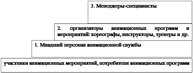 Для того, чтобы у аниматоров был стимул постоянного повышения квалификации, совершенствования навыков и умений, необходимо показать аниматору возможности профессионального роста. Это является дополнительным стимулом для персонала. За последнее десятилетие индустрия туризма и досуга значительно выросла и сейчас в 4 раза превосходит автомобильную отрасль, поэтому она имеет большое экономическое значение. Индустрия досуга очень разнообразна, она охватывает общественный, частный, коммерческий сектор, включая туризм, искусство, культуру, музеи, национальное наследие, спорт, места отдыха, парки и т.д. Индустрия досуга находится под влиянием изменений, происходящих на телевидении, в средствах массовой информации, информационных технологиях, а также изменений социальных вкусов и привычек. Многие люди признали необходимость уделять больше внимания проблеме здоровья и улучшению состояния окружающей среды. Правильная организация досуга может способствовать решению этих проблем и повлиять на уровень жизни. Все это привело к тому, что все большее количество людей вовлекается в организацию досуга. Организаторы могут находиться на разных ступенях служебной лестницы, в зависимости от квалификации. Всего в служебной лестнице аниматорской службы возможны 3 основные ступени (см. рис.): 1. младший персонал анимационной службы; 2. организаторы анимационных программ и мероприятий: хореографы, инструкторы, тренеры и др.; 3. менеджеры-специалисты.
