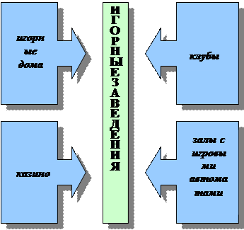 Рис. 7.1.Игорный бизнес К игорному бизнесу относят: · игорные заведения: игорные дома, казино, клубы, залы с игровыми автоматами; · предприятия по выпуску оборудования и аксессуаров для игорного бизнеса; · издательства, выпускающие книжную продукцию для игорного бизнеса. Игорные заведения – это специальные заведения, где организованы игры в карты, рулетку и другие, как правило, азартные игры.