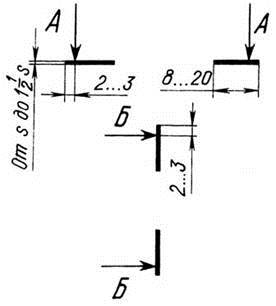 Положение секущей плоскости на чертеже указывают линии сечения. Для горизонтальных разрезов линии сечения указываются на главном виде или виде слева, для фронтальных – на виде сверху и слева; для профильных на главном виде и виде сверху. Для линии сечения применяется разомкнутая линия толщиной от S до 1,5S (см. ГОСТ 2.303-68). Для простых разрезов вычерчиваются начальный и конечный штрихи (рис. 12.2), а для сложных – начальный, у перегибов и конечный штрихи (рис. 12.12). Начальный и конечный штрихи линий сечения не должны пересекать контур соответствующего изображения. На этих штрихах перпендикулярно к нам следует ставить стрелки, указывающие направление взгляда. Стрелки находятся на расстоянии 2-3 мм от конца штриха (рис. 12.3)