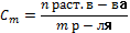 12. Классификация растворов. Способы выражения концентрации растворов (массовая доля, молярная, моляльная, эквивалентная концентрация, моляльная доля). Закон эквивалентов для растворов. Классификация растворов: твердые (драг. камни), жидкие (ртуть + серебро), газооброзные. Способы выражения концентрации растворов: 1. Массовая доля раств-го вещ-ва (%-я С) 13 Коллигативные свойства растворов. Понижение температуры замерзания. Повышение температуры кипения. Закон Рауля. Коллигативные свойства – это свойства растворов, зависящие от числа частиц растворенного вещества. К коллигативным свойствам растворов относят: 1) понижение давления насыщенного пара растворителя над раствором, 2) понижение температуры замерзания и повышение температуры кипения растворов по сравнению с температурами замерзания и кипения чистых растворителей. 3) осмотическое давление. Понижение температуры замерзания:; - кристаллическая константа (из справочника) Повышение температуры кипения:; Закон Рауля: 14. Произведение растворимости. Условия образования осадка. Произведение растворимости (ПР, Ksp) — произведение концентраций ионов малорастворимого электролита в его насыщенном растворе при постоянной температуре и давлении. Произведение растворимости — величина постоянная. При постоянной температуре в насыщенных водных растворах малорастворимых электролитов устанавливается равновесие между твердым веществом и ионами, образующими это вещество. Например, в случае для CaCO3 это равновесие можно записать в виде: CaCO3(s)⇌Ca2+(aq)+CO2−3(aq) Константа этого равновесия рассчитывается по уравнению: K ={Ca2+(aq)}{CO2−3(aq)}{CaCO3(s)}. В приближении идеального раствора с учётом того, что активность чистого компонента равна единице, уравнение упрощается до выражения: K sp=[Ca2+(aq)][CO2−3(aq)].Константа равновесия такого процесса называется произведением растворимости. Осадок -выделение в виде твердого в-ва из газа (пара), раствора или расплава одного или нескольких компонентов. Для этого создают условия, когда система из исходного устойчивого состояния переходит в неустойчивое и в ней происходит образование твердой фазы. Осаждение из пара (десублимация) достигается понижением температуры (напр., при охлаждении паров иода возникают кристаллы иода) или химических превращений паров, к которому приводят нагревание, воздействие радиации и т.д. Так, при перегревании паров белого фосфора образуется осадок красного фосфора; при нагревании паров летучих Осаждения твердой фазы из растворов можно добиться различными способами: понижением температуры насыщенного раствора, удалением растворителя выпариванием (часто в вакууме), изменением кислотности среды, состава растворителя, например добавлением к полярному растворителю (воде) менее полярного (ацетон или этанол). Последний процесс часто называют высаливанием. Широко применяют для осаждения различные химические реагенты-осадители, взаимодействующие с выделяемыми элементами с образованием малорастворимых соединений, которые выпадают в осадок. Например, при добавлении раствора ВаСl2 к раствору, содержащему серу в виде SO2-4, образуется осадок BaSO4. Для выделения осадков из расплавов последние обычно охлаждают. Электроли́т — вещество, которое проводит электрический ток вследствие диссоциации на ионы, что происходит врастворах и расплавах, или дв