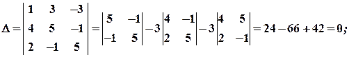 Так как определитель равен нулю, то ранг матрицы системы меньше 3, то есть система не имеет ненулевых решений. Найдём общее решение методом Гаусса.
