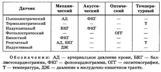 Любое медико-биологическое исследование связанно с получением и регистрации соответствующей информации. Не смотря на разнообразие устройств и методов, употребляемых для этой цели, можно узнать их общие схемы и принципы действия. Для того чтобы получить и зафиксировать информацию о состоянии и параметров медико-биологической системы, необходимо иметь целую совокупность устройств. Первичный элемент этой совокупности называется устройством съема. При диагностики электроды используются еще и для подведения внешнего электромагнитного воздействия например в реографии. Электроды используются также для оказания электромагнитного воздействия с целью лечения и при электростимуляции. К электродам предъявляются определенные требования: они должны быстро фиксироваться и сниматься, иметь высокую стабильность электрических параметров, быть прочными, не создавать помех, не раздражать биологическую ткань. Важная физическая проблема относящаяся к электродам для съема био сигналов, заключается в минимизации потерь полезной информации. Особенно на переходном сопротивлении электрод-кожа для этого используют марлевые салфетки, смоченные физ раствором или электропроводящие пасты. Электроны для съема био сигнала делятся на группы: 1) для кратковременного применения в кабинетах диагностики 2) для длительного использовании за тяжело больными 3) для использовании на подвижных обследуемых в спортивной или космической медицине 4) для экстренного применения в скорой помощи. Для бессознательного больного надежнее использовать игольчатые электроды. Многие медико-биологические характеристики нельзя снять электродами: давление крови, температуры, пульс. Используют датчики. Датчиком называют устройство, преобразующее измеряемую или контролируемую величину в сигнал, удобную для передачи или регистрации. Датчик, к которому подведена измеряемая величина, называется первичным. Датчики бывают: генераторные и параметрические. Генераторные под воздействием измеряемого сигнала не посредственно генерируют напряжение или ток. 1) Они основаны пьезоэлектрическом и 2) термоэлектрическом эффекте 3) индукционном 4) фотоэлектрическом эффекте. Параметрические датчики под воздействием измеряемого сигнала изменяют, какой либо свой параметр. Они бывают: 1)емкостные 2) реостатные 3) индуктивные. В зависимости от вида энергии различают: механические, акустические, температурные, электрические, оптические датчики.