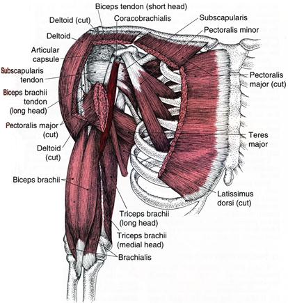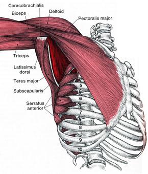 Анатомия мышц правого плеча (вид спереди). Клювовидно-плечевая мышца (темно-красная) проходит перед прикреплениями подлопаточной мышцы, широчайшей мышцы спины и большой круглой мышцы, но позади большой грудной мышцы. Передняя зубчатая мышца удалена. Клювовидно-плечевая мышца лежит медиальнее короткой головки двуглавой мышцы и пальпируется на плечевой кости в передней части подмышечной ямки под большой грудной мышцей (J.Travel & D.Simons, 1999).