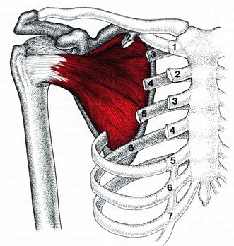 Рис. 3.20 положение подлопаточной мышцы (темно-красная) относительно окружающих ее мышц (светло-красные), когда лопатка (светлая вертикальная линия) оттянута врачом от грудной клетки (J.Travel & D.Simons, 1999). Рис. 3.21 Прикрепления правой подлопаточной мышцы. Плечо вывернуто наружу. II-IV ребра удалены (J.Travel & D.Simons, 1999).