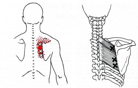 Рис. 3.22 Локализация триггерных точек (показано крестиками) в правой подлопаточной мышце и распределение вызванных ими болей. Области, окрашенные в красный цвет – основные болевые зоны; красными точками отмечены зоны разлитой боли. На рисунке справа II-IV ребра удалены (J.Travel & D.Simons, 1999). БОЛЬШАЯ И МАЛАЯ РОМБОВИДНЫЕ МЫШЦЫ (m. Romboids major, minor)