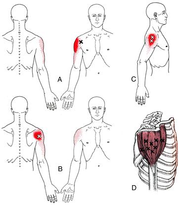 Рис. 3.28 Прикрепления клювовидно-плечевой мышцы. Верхний конец короткой головки двуглавой мышцы плеча загнут (J.Travel & D.Simons, 1999). Рис. 3.29 Локализация триггерной точки в клювовидно-плечевой мышце и распределение вызванной ею боли. ТТ могут локализоваться в середине мышцы. В некоторых случаях боль может распространяться только на локоть (J.Travel & D.Simons, 1999).