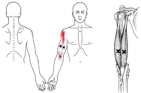 Рис. 3.31 Локализация триггерных точек (показано крестиками) в дистальной части правой двуглавой мышцы плеча и распределение вызванной ими боли. Области, окрашенные в красный цвет – основные болевые зоны; красными точками отмечены зоны разлитой боли (J.Travel & D.Simons, 1999).
