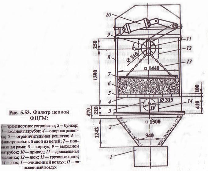 В зависимости от габаритов фильтра рыхление проводят вручную или механически с приводом от электродвигателя. Чаще всего размер зерен в рассматриваемых фильтрах составляет 0,2—2 мм; воздух направляется сверху вниз. Нагрузку воздуха в зависимости от исходной концентрации (г— 1—20 мг/м3) принимают от 2,5 до 50,0 м3/(м2-мин); начальное сопротивление при этом составляет 50—200 Па. Высота слоя на сетках выбирается от 10 до 15 см. Остаточное содержание пыли в очищенных газах обычно составляет 10—100 мг/ м3; эффективность очистки до 99,5%. При начальной концентрации пыли более 12 г/м3 перед гравийными фильт рами устанавливают циклоны. Зернистые насыпные фильтры предназначены для очистки газов от пылей механического происхождения (от дробилок, грохотов, сушилок, мельниц, транспортирующих устройств). Они применяются при получении цемента, извести, гипса, фосфорных удобрений и других производств, при наличии абразивной пыли и агрессивных газов или веществ, плохо улавливаемых в электрофильтрах и других пылеуловителях. Однако в этих фильтрах нельзя очищать трудноудаляемые пыли. Наибольшее распространение в РФ получили отечественные фильтры: роторные зернистые фильтры ФЗРИ-100, ФЗРИ-50; фильтры с вертикальным радиальным рас Положением секций ФЗВИ-30-1-300; зернистые фильтры — циклоны ФЦЗ; зернистые кассетные фильтры ЗФ; цепные фильтры ФЦГМ и ФЦ,-1П(1Э). Конструкция цепного фильтра представлена на рис. 5.53. Принцип его |ействия основан на осаждении частиц пыли в фильтрующем элементе, (выполненном из цепей. Во время фильтрации верхняя рама с цепями опущена на нижнюю. Цепи находятся в сложенном состоянии и образуют фильтрующий слой. Регенерация фильтрующего слоя производится автоматически путем поднятия и опускания верхней рамы с цепями. Для переключения с фильтрации на регенерацию и обратно служит клапанное устройство. Уловленная пыль без дополнительной переработки возвращается в технологический процесс. Производительность данного фильтра — 10 000 м3/ч, максимальный Перепад давления — 500 Па, эффективность очистки — 96-98%. Зернистые фильтры с движущейся средой. Свойство сыпучести зернистых материалов используют для создания фильтров с движущейся средой И периодическим или непрерывным удалением из установки на регенерацию слоя зёрен, забитого пылью.