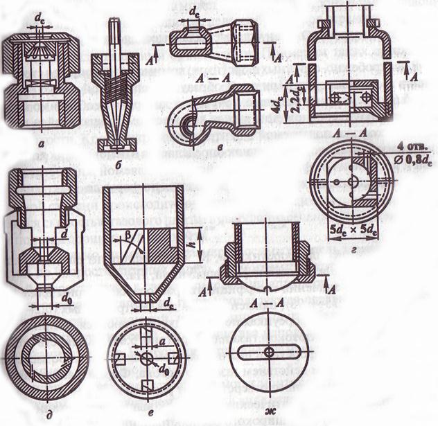 Рис. 5.59. Механические форсунки: в — цетробежные форсунки (а — Григорьева-Поляка; б — Кертинга; в — эвольвентная форсунка); е—центробежно-струйные форсунки (г — ВТИ; д —с цилиндрическим вкладышем и горизонтальными каналами; е — с цилиндрическим плоским вкладышем и с периферийными винтовыми каналами); ж – плоскофакельная струйная форсунка