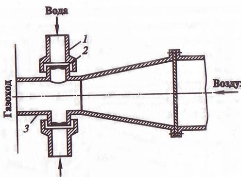 Рис. 5.61. Пневмофорсунка: 1 - патрубок для подвода воды; 2— элемент плоскофакельной форсунки; 3 — горловина