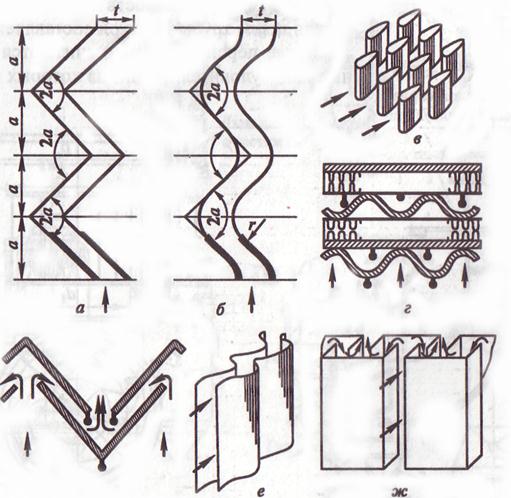 Рис. 5.63. Элементы инерционных каплеуловителей: а, б — горизонтальные жалюзийные; в — прямоточный сепаратор Карбейта; г — гофрированные вязаные сетки; д — уголковые; е — вертикальные жалюзийные; ж — швеллерковые