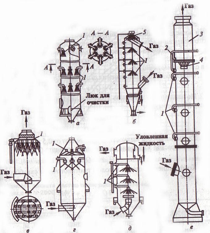 Рис. 5.67. Конструкции полых скрубберов: а - с тарельчатыми форсунками; б — конденсационная башня; в- д —колонны улавливания фтористых газов и аммиака; е — скруббер типа СП; 1—ярусы орошения; 2 — система гидросмыва каплеуловителя; 3 — капле- уловитель; 4— завихритель; 5—форсунки газохода