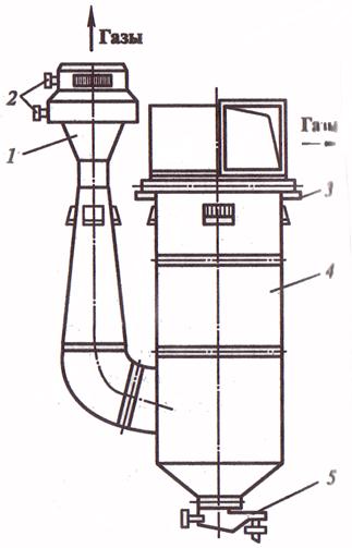 Рис. 5.85. Коагуляционный мокрый пылеуловитель типа КМП: 1 — труба Вентури, 2,3— штуцеры для подводи воды соответственно в трубу Вентури и каплеуловитель; 4 — циклон-каплеуловитель; 5— гидрозатвор для отвода шлама